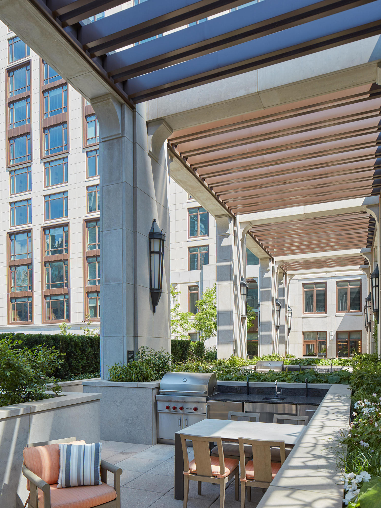 - Landscaped grand terrace overlooking Lake Michigan with lounge furniture and an outdoor Sub-zero Wolf kitchen