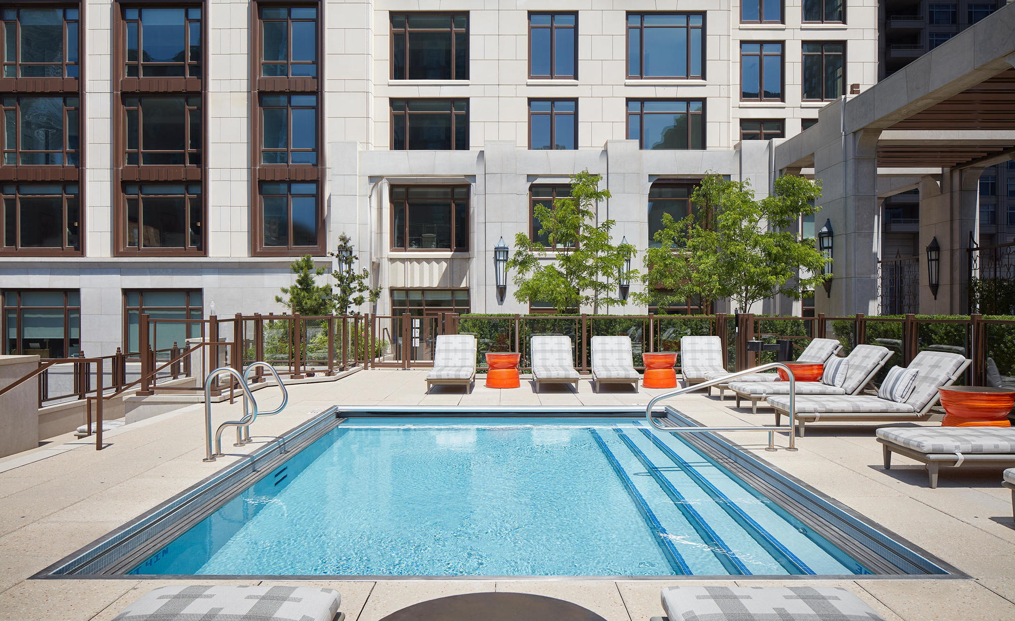 10,000-square-foot recreational deck overlooking Bennett Park, featuring an outdoor pool with lounge area, reservable outdoor kitchens and cabanas, along with fire pit lounges.